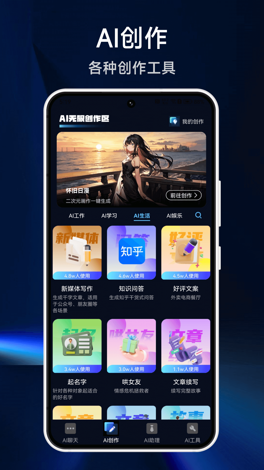 -智能聊天:探索未知的世界,像朋友一样聊天 -AI创作:让你的创作妙笔生花 -文章创作:帮您写出优质文章