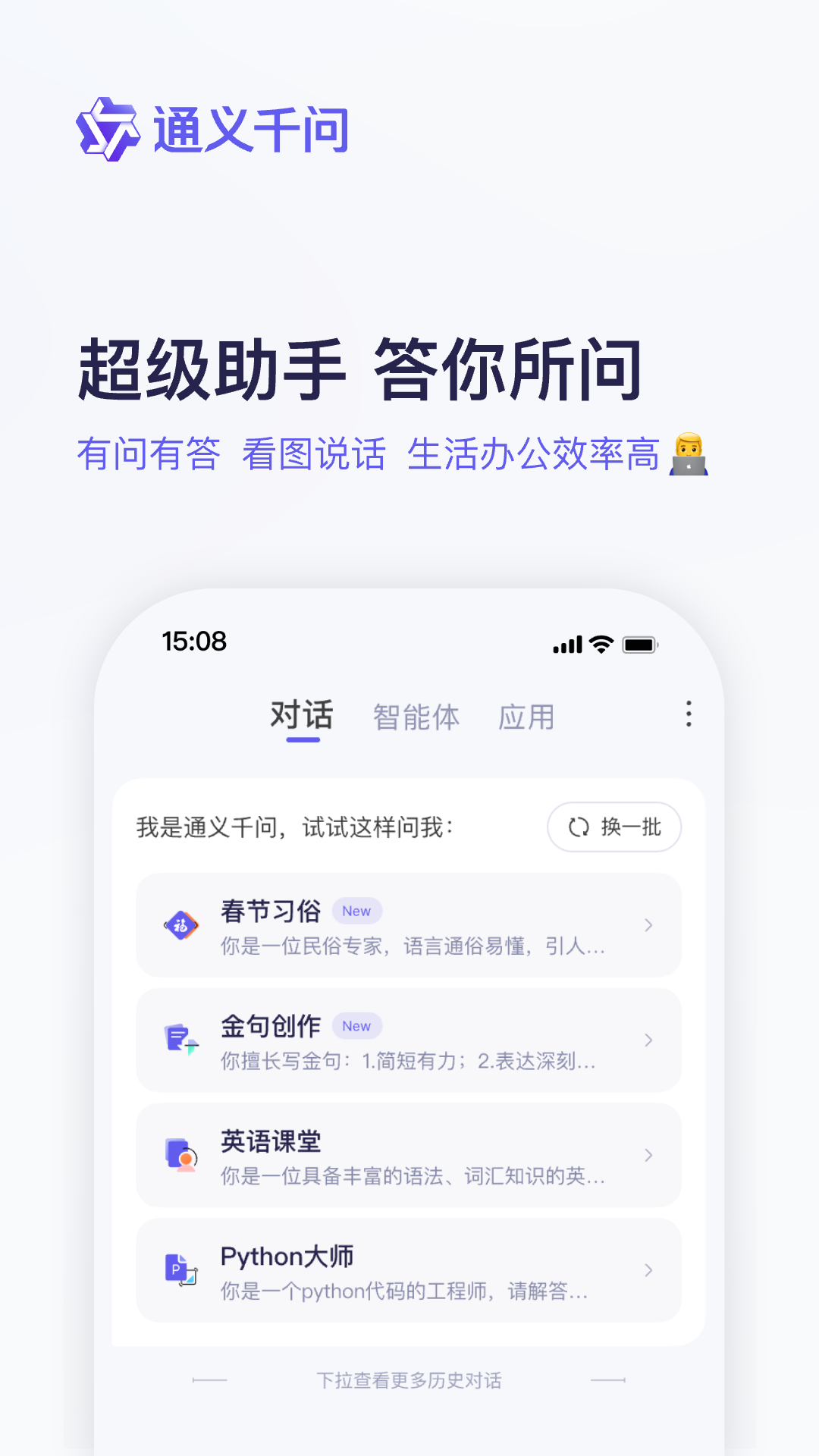 学习助手:对于学习者来说,通义可以解答学习中遇到的问题,包括中英文互译、数学题目解答、文言文翻译等。这款功能特别适合学生和自学者,让他们的学习过程更加轻松和高效。
