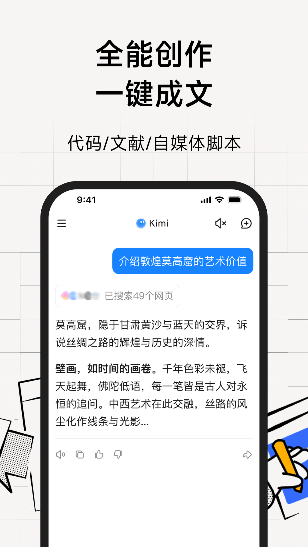 Kimi 是一个拥有超长无损记忆的 AI 助手,随时为你回答问题、速读文件、整理资料、激发灵感、辅助创作。