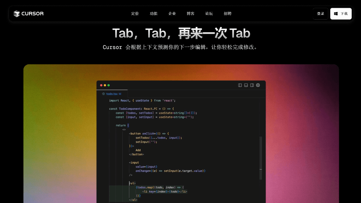 代码生成:Cursor能根据开发者的指令或代码上下文自动生成代码,节省编写基础代码的时间。