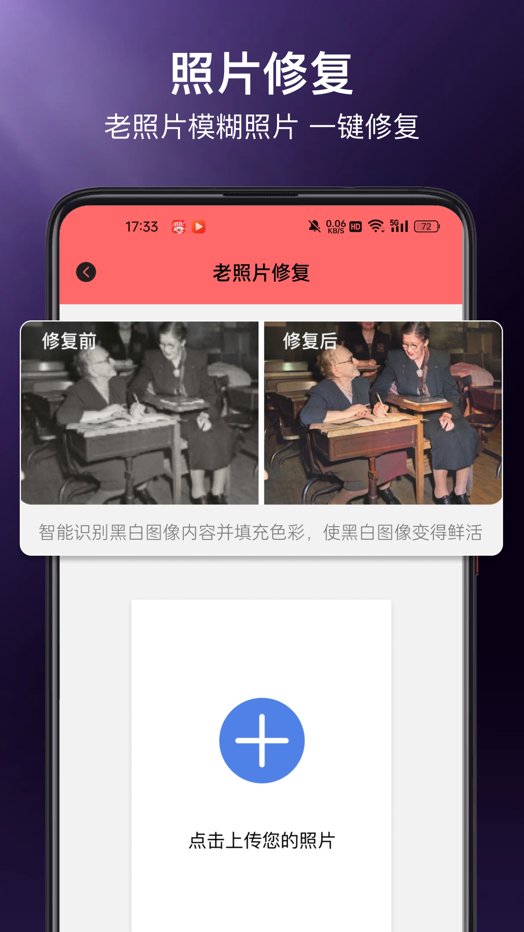 【照片清晰度增强】 使照片变得更清晰,使用人工智能技术,可以将模糊照片、低清照片痕迹修复 【黑白照片