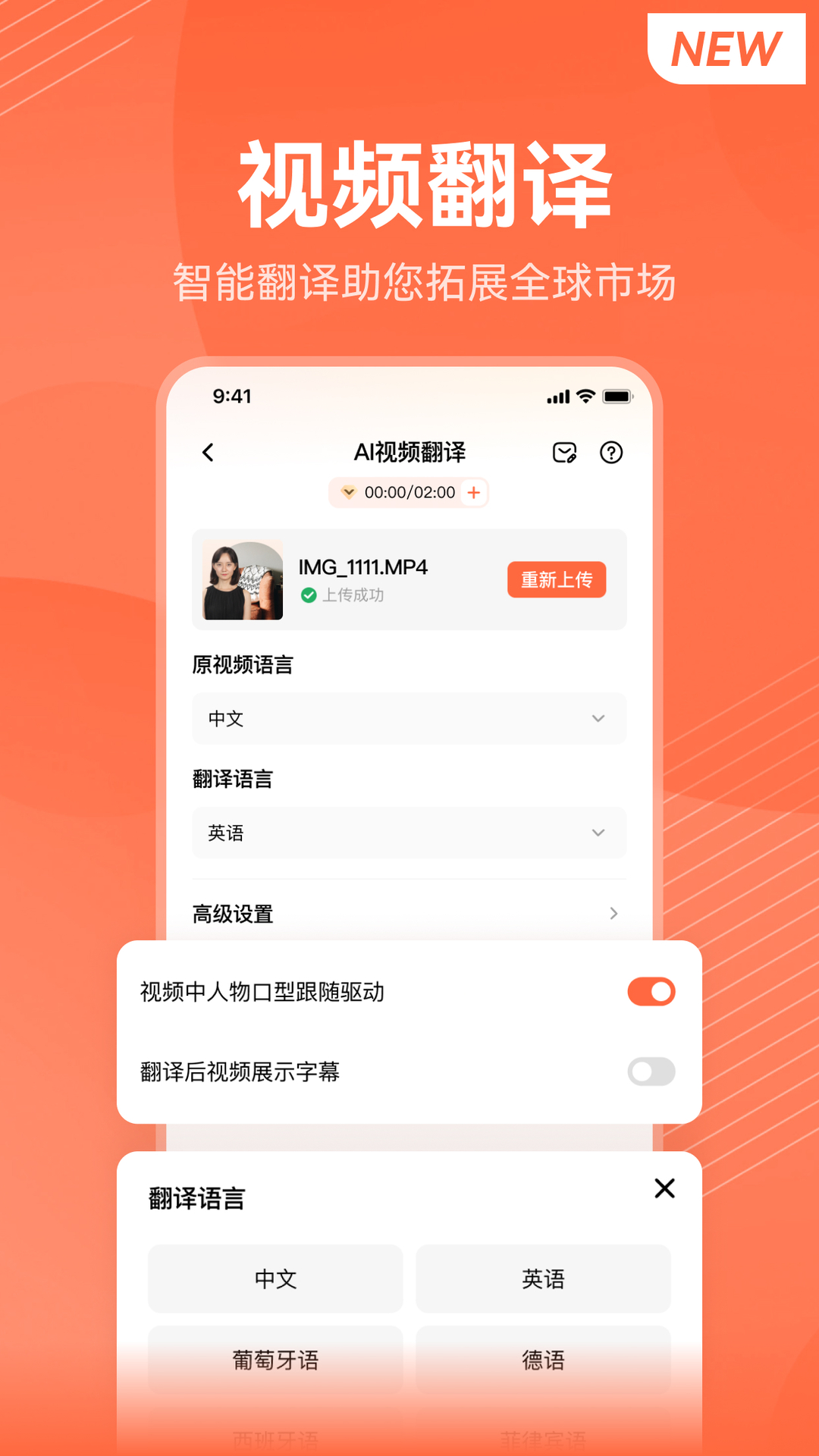 AI视频翻译:通过语音识别技术,将视频中的语音转换成不同语言,并生成字幕。