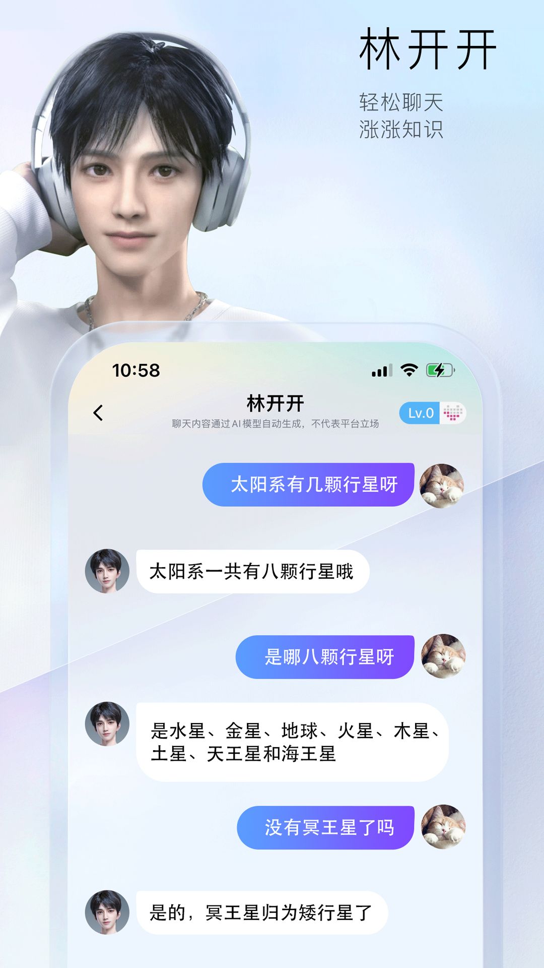 小侃星球APP的主要功能虚拟人:用户可以与AI虚拟角色林开开和叶悠悠进行自然的语言交流,讨论各种话题。24小时陪伴:提供全天候的服务,无论何时,用户都能找到虚拟好友进行交流。哄睡功能:为了帮助用户放松和入睡,APP提供了专门的哄睡功能,通过温柔的语音和舒缓的对话帮助用户更好地休息。亲密度提升:随着与虚拟角色的互动,用户的亲密度会逐渐提升,解锁更多互动内容和功能。无广告体验:小侃星球APP承诺无广告,为用户提供一个干净、纯粹的环境。