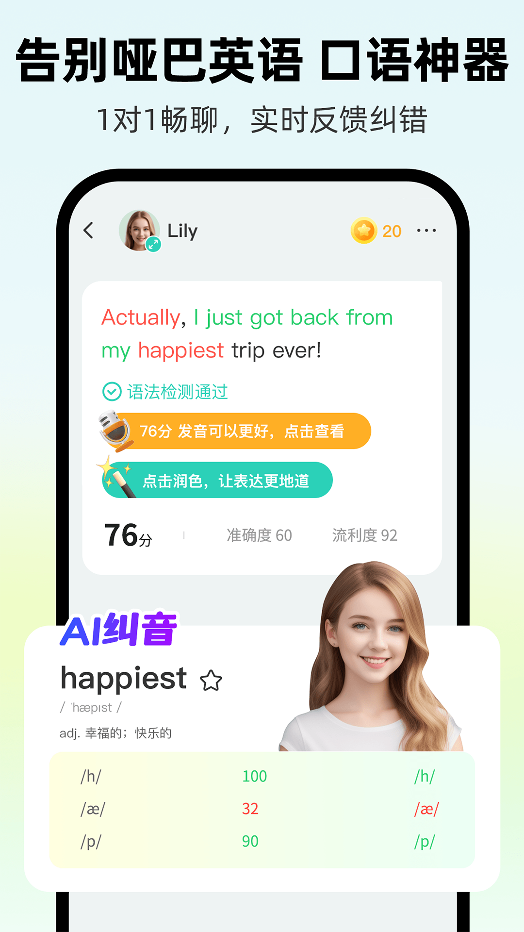 AI语法纠错,音节级打分纠音,专业语法指导,再也不用担心说错。