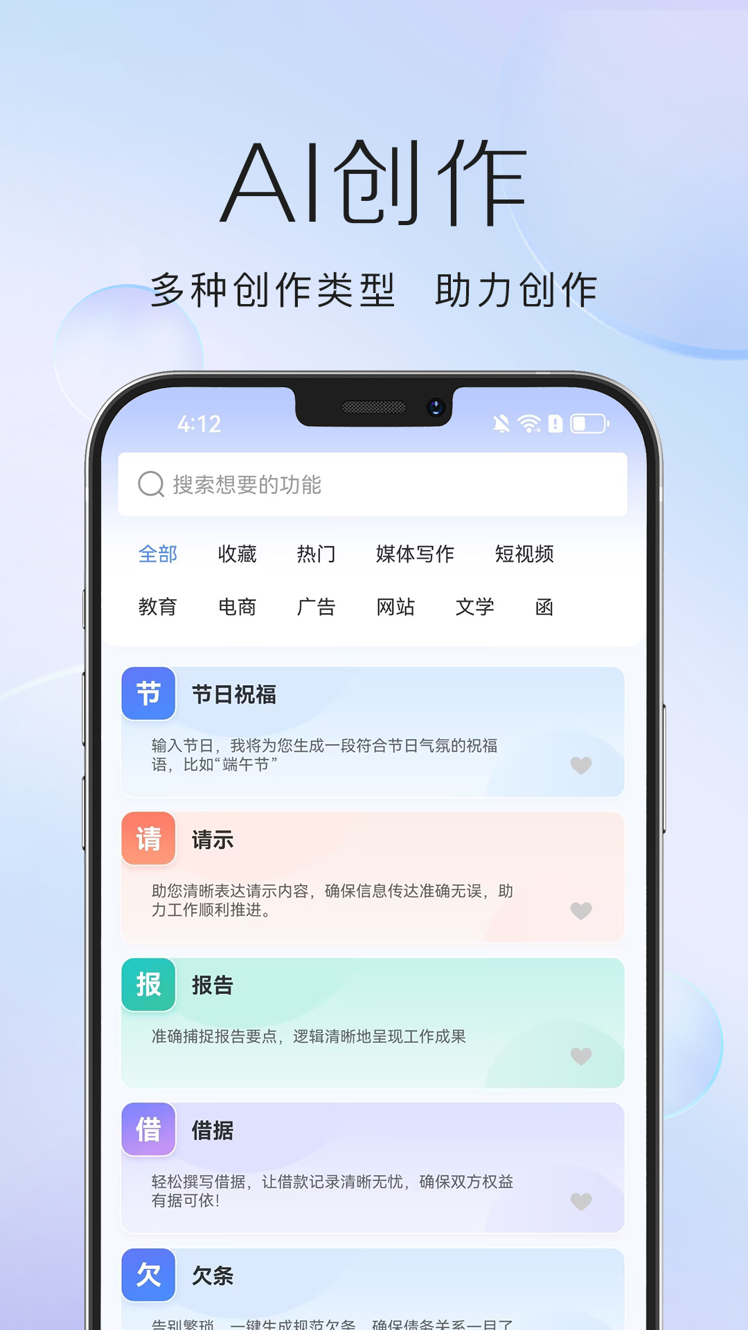 无论您创作何种内容,当您苦于缺乏灵感时,它或许能帮您开启创作的思路,激发写作灵感,从吸引人的产品卖点到独特的产品描述,再到万众瞩目的标题,无论是媒体写作、制作短视频文本,还是日报/周报/月报、教案设计,AI写作管家都能帮您生成令人满意的内容。