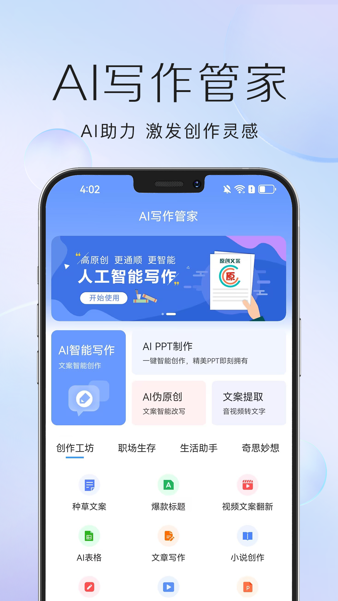 AI写作管家是一款轻松上手、简单实用的写作软件,自带一键AI智能写作、AI生成PPT等功能,还拥有多