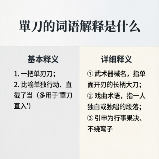 【單刀的词语解释是什么】提到“單刀”这个词,咱们普通人脑子里蹦出来的画面,多半还是关云长那个形象,或者是武侠小说里那种一手持刃的感觉。其实吧,查字典能查到最基础的解释,但真正要把这个词用活了,得从好几个层面去琢磨。它不仅仅是一把兵器的名字,还藏着不少历史典故和行事风格的味道。